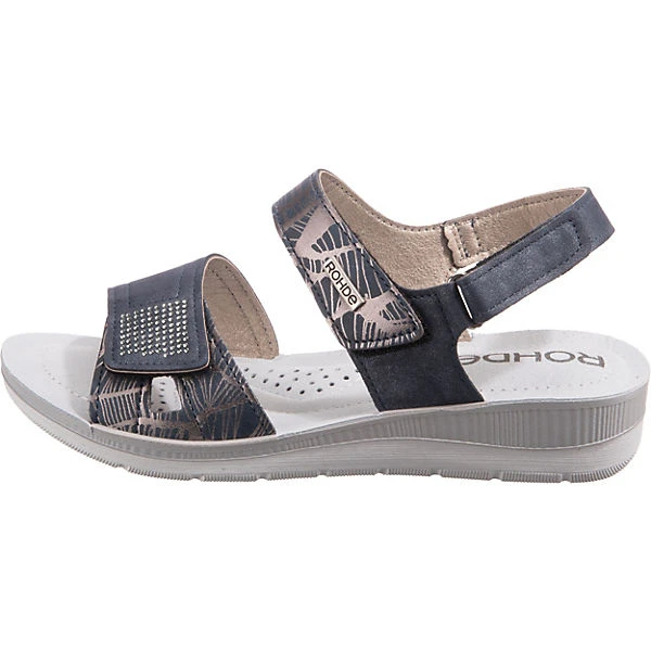Die Komfort-Sandalen der Marke ROHDE versprechen ein angenehmes Tragegefühl. Der niedrige Keilabsatz bietet einen ansprechenden Look. Das Fußbett besteht aus Echtleder und ist außerdem komfortabel gepolstert. Das Obermaterial des Schuhs ist aus Kunstleder. Ein bequemer Sitz ist dank des Klettverschlusses ein Leichtes.