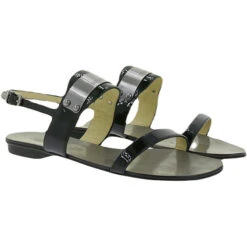 Sandaletten für Damen aus elegantem Lackleder Slingback-Verschluss gebürstete Metall-Platten-Applikation auf Spann mit CRISTIANO RONALDO Schriftzug Made in Portugal Flacher Absatz Innenmaterial: Echtleder Außensohle: Echtleder Gewicht je Schuh: circa 210g bei Größe EUR 38